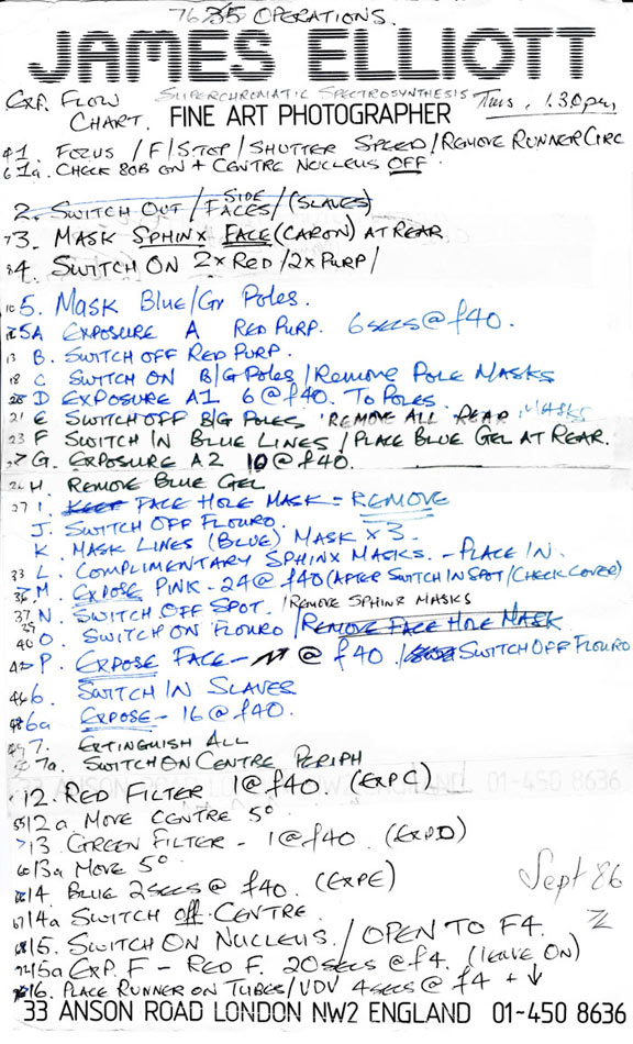 THE 76 ACTION EXPOSURE SEQUENCE EGYPTIAN HIEROGLYHICS Note the notepaper, boldly proclaiming FINE ART PHOTOGRAPHER. Interesting, as few used such an epithet in 1986. Certainly no-one in Europe, unless we missed someone. Elliott was a pioneer and an artist photographer from the late Sixties. He made no secret of the fact that he was not a commercial photographer, like the others. Whilst others boasted their client list, Elliott was only interested in the quality of the art he was creating. The sheet of paper shows the 76 actions required to complete an exposure., each stage of which had to be perfect. The list looks like Egyptian hieroglyphics in places. Each exposure took 20 mins to execute. Assuming you got it right. Note extreme exposures and apertures - 24 secs at f40 etc. There is no f40 on a medium format film camera. Elliott had the inner cam of the lens ground down to extend the aperture from f22 to f40. This modus operandi list was essential at the time, as it is impossible to remember 76 actions in sequence, never mind execute them perfectly. ![]() If you count the exposures there are in fact eleven, all of which had to balance with each other. The rear central circle revolved between exposures to achieve the polychromatic colours. The foreground halo was a revolving light source drawn in with a long exposure and a guide rail, which was removed after each exposure. Incredibly difficult. |