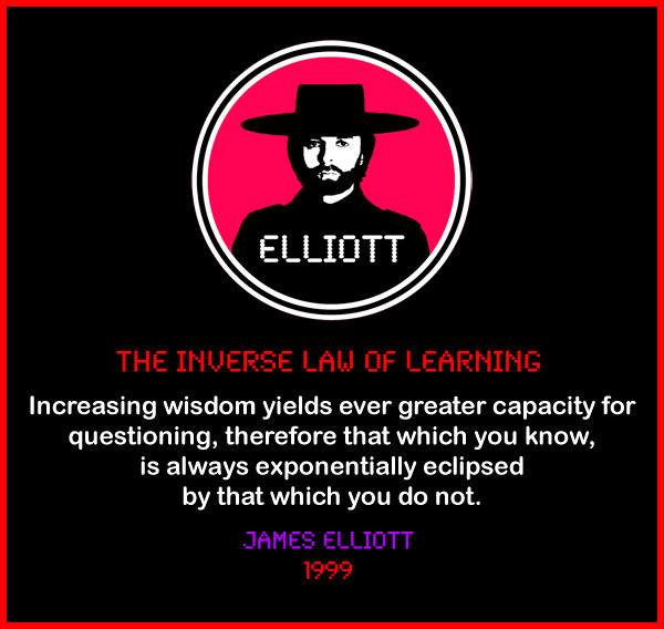 by James Elliott Scientists want to know how the Cosmos was created and how we got here. Ambitious, considering we don't even understand each other. The fact that attempts are being made to comprehend our origins is unequivocal proof that the challenge is not fully understood. Should we attempt it? Considering the scale of the unfathomable riddle, even to the cleverest of minds, probably not. From a local perspective and asking questions closer to home, Darwin had hoped time would 'fill in the gaps' to his theories. It hasn't. It has enlarged them. The knowledge available to us now, which was not available to Darwin, has simply meant we have augmented our knowledge but diminished our understanding. The same observation could be made regarding the Cosmos, especially since the Hubble Telescope. Current estimates suggest there are around 2 trillion galaxies. I'm not sure who is counting them, but the lifetime of many people would be required to count up to such a number. The more we discover the less we comprehend. I first conceived this as an inverse law of learning in 1999.