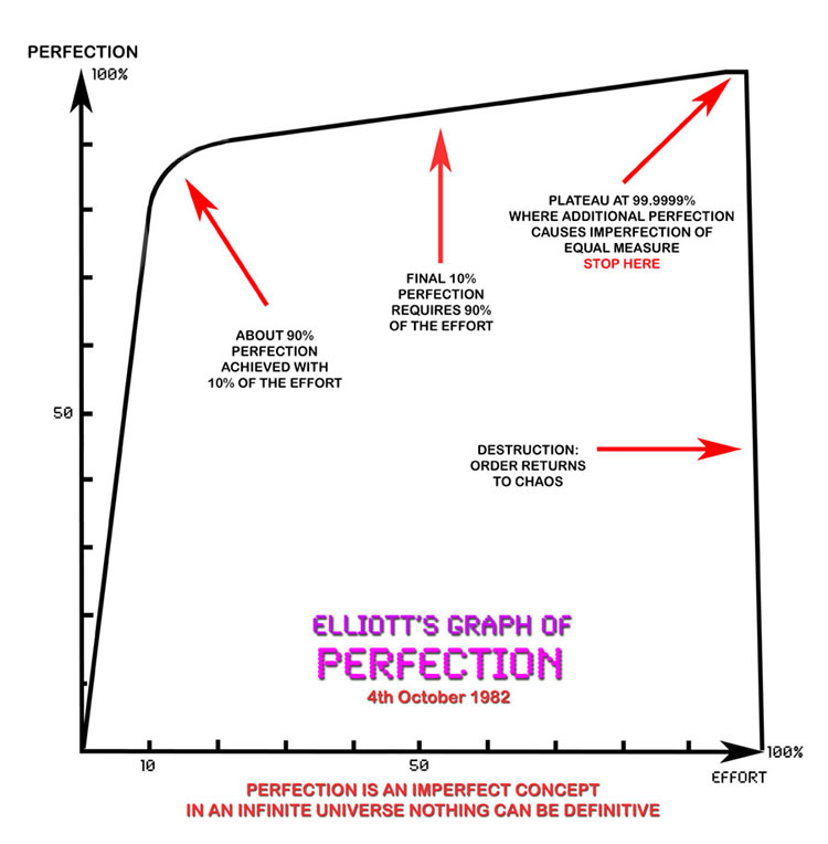 Perfection is not a case of being 100%. It is about reaching the point at which imperfections are imperceptible. The concept of perfection is ironically, imperfect. The fact is, that 99.999% black is not a shade of grey, it is actually black. Why? Because you cannot distinguish one from the other. Humans cannot perceive the other one thousandth of a per cent blackness. They can't perceive even one per cent. So any such 100% specification is pointless. In fact the eye can be quite accommodating and will accept as black, anything down to 85% grey, depending on the circumstances. Perfection is the point at which no imperfection can be perceived, even by the critical, perfectionist observer. So perfection can and does exist. Evolution and the BIg Bang theory are both suboptimal ideas. They are both a paragon of imperfection. It seems to me that with evolution, it is far more likely that different species evolved in different ways, in different environments. Why should it be linear? Why should one thing evolve into another? And remember Darwin made almost no mention of human evolution. I have no orthodox religious beliefs, personally. I don't believe in anthropological Gods as currently perceived by the masses. I can however, observe the metaphysical superpowers, the ordering forces, everywhere I look. I can SEE this. It is not some random belief or a byproduct of religious inculcation or indoctrination. If you understand in the slightest, things at the atomic level, the complexity of physicality right down to living cells and the dumbfounding depths of the cosmos, you will know what I mean. It's hard not to see the miraculousness of it all. Scientists have obviously never done anything of a very creative nature, otherwise they wouldn't bother to search for origins. I often look at my latest artistic tour de force and think to myself, "That's amazing! How the hell did that get here?!" I know intellectually, of course, that I created it - I'm not that mad! But if you asked me how I did it, I have absolutely no idea. And when I say this, people think that I am just being secretive about my methodology. But I am not. No man alive could trace that back, not even me. My anthropological masterpiece, 'Nemesis' for example, I can tell you was created ex nihilo. Rather as cosmologists believe everything else was. I started out with nothing more than an empty black square. A void. One could argue philosophically that phenomenologically that is still something! Is space something or the absence of everything? Or is it paradoxically both?