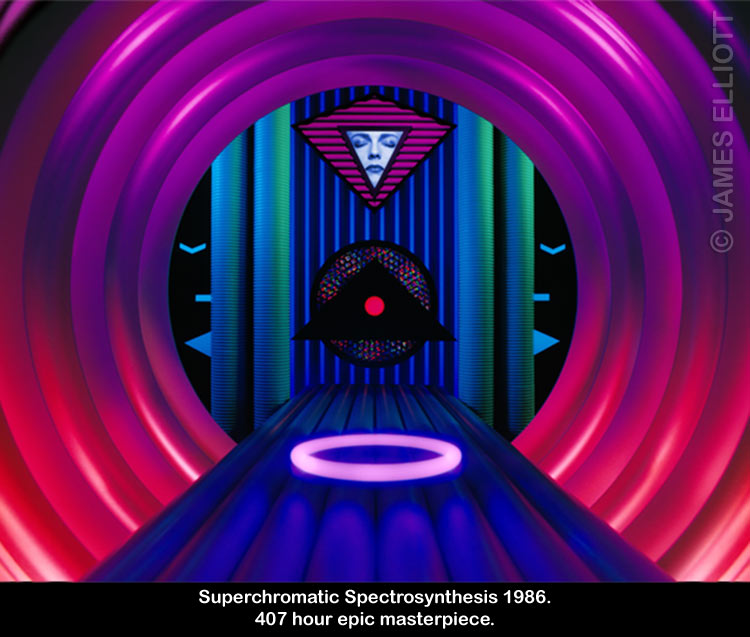 The entire summer of 1986, from May to September, was spent creating the world's first photo light sculpture. The entire piece was created from scratch by the artist. It had a 76 action exposure sequence, required 21 lights, 40 Polaroids, 160 test exposures, endless rolls of film and was exposed in 7 layers. It took 407 hours of work to create. Various elements moved during the exposures and the entire structure was silver and white, with colour only introduced via the lighting. This ensured the high saturation of colour. It was the last great 'Symphony For The Camera', as Elliott called them. After the artist moved to Belsize Park, his trajectory completely changed. Elliott moved during creation of this image and had to maintain two studios as 'Superchromatic Spectrosynthesis' was standing in his former studio unfinished. This continued for months, at great expense, until the masterpiece was ultimately completed.
