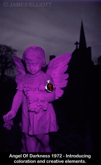 Elliott began to introduce creative elements for greater control and expression, as in 'Angel Of Darkness'. Apart from introducing the previously created watch into the picture, this image also shows controlled coloration and de-synchronised flash. Together these things are hugely expressive. The picture is an early example of the Gothic period, which were all created in haunting landscape settings and largely concerned with mortality and spirituality. Heavyweight stuff for a young man just out of his teens.