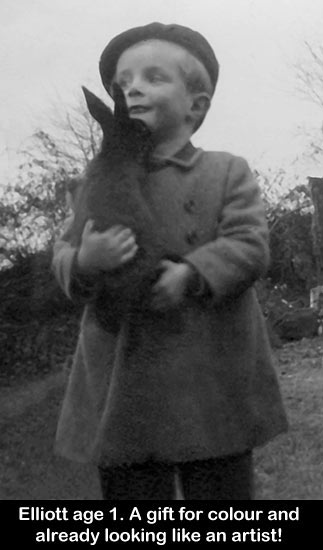 At 18 months old, Elsa noted that the baby Elliott had a gift for colour. She recalled he could name them all. One day she pointed to something blue and the baby Elliott said "Blue". She then pointed to something green and he said "Green." Then, in an attempt to trick him, she pointed to something turquoise. 'Blue-green", the young Elliott replied. Scientifically correct and the only description, his limited vocabulary would allow.