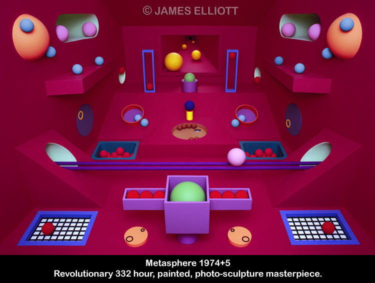 In the early work, a metamorphosis can be seen to take place, as Elliott shifts away from observational photography, towards the creation of his own reality, with images straight out of his imagination. This progresses through an incredible arc until eventually he creates the revolutionary 'Metasphere' 1974-5, where every square millimeter was created by the artist. It is also progresses Elliott's concept of the epic photograph. It took 332 hours of work to create. The artist even mixed all the colours to match.
