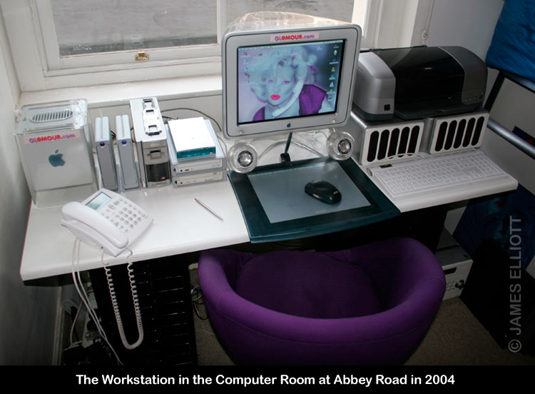 The minute he moved into Abbey Road, Elliott designated a separate, special Computer Room, to create his masterpieces. Note that Elliott never, ever, used a mouse. He started on graphics tablets in the Eighties and never changed, as they are capable of infinitely greater precision. Much of his work is extremely exacting. He uses a puck and a pen for different tasks. He wears out a lot of them. Many fine computers have passed through the Computer Room, from the Apple PowerMac 266, to The Cube, the Mac Pro and today the beautiful iMac 27 inch.