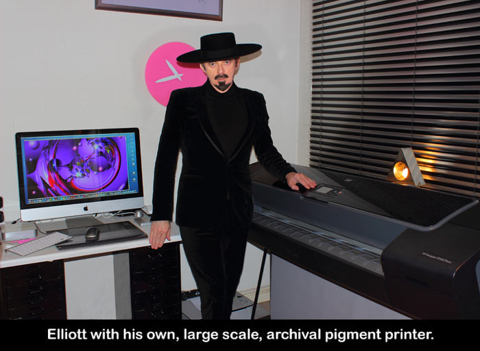 Elliott has always been an archivist, in fact since 1973. Although the artist pioneered computer art, he held back on printing until digital conformed to his strict and demanding criteria, with regards to quality and longevity. The earliest pieces were output onto extremely high quality 5 x 4 transparencies and printed traditionally on Cibachrome. Elliott knew that dye sublimation prints and Iris prints weren't that good, so he continued converting to analogue, until digital caught up with his extremely high standards, from an image quality and archival standpoint. Simply put, early digital was vastly inferior to conventional analogue The latest giclée printers are capable, in the right hands, of the highest quality imagery ever. As indeed, can be seen in his latest pieces.