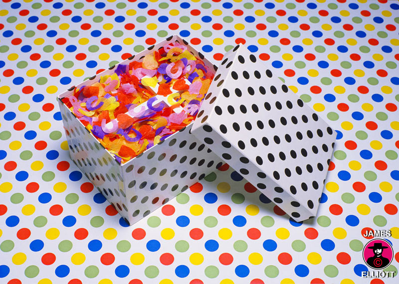 Elliott states the image was inspired by wedding photos with confetti flying through the air. The whole thing looks like a bit of a party - very positive and celebratory in its feel. The gift box, the polka dot background, visually echoed in the confetti and the use of "Christmas colours" all suggest something rather wonderful. The image has a sort of 'swarming buzz of life' about it. A busy beauty full of visual jazz. But it also has a darker side. Perhaps it rather laconically sums up the sacrifices we often make for greater gains, especially in relationships and in a deeper sense, in life.