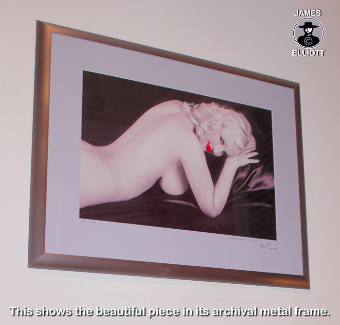 Total Number Of Originals: 8 (1 available) Size Of Piece : 22 X 16 inches Size Of Frame : 31 x 25 inches Original Type : Archival Pigmented GiclŽe Hand printed : by The Artist For Price: Contact Us SIGNED BY THE ARTIST IN STOCK ARCHIVAL MOUNT. LUXURY METAL FRAME This masterpiece appeared in the historical anthology 'The Story Of Nude Photography'. A large hardback coffee table book. Elliott's trademark of using a splash of colour on monochrome, is incredibly powerful and can be traced back h alf a century. This image has classic written all over it. If ever an image balanced class and sex appeal with equal measure, this has got to be it. The artist spontaneously captures a beautiful expression which puts to shame all those commercial pinned-back grins. The way in which Elliott manipulated the tonality to render the girl like a sculpture cast in marble, involved pioneering innovation with channel mixing. The black satin gives a dark twist to an image full of light. Sheer class!