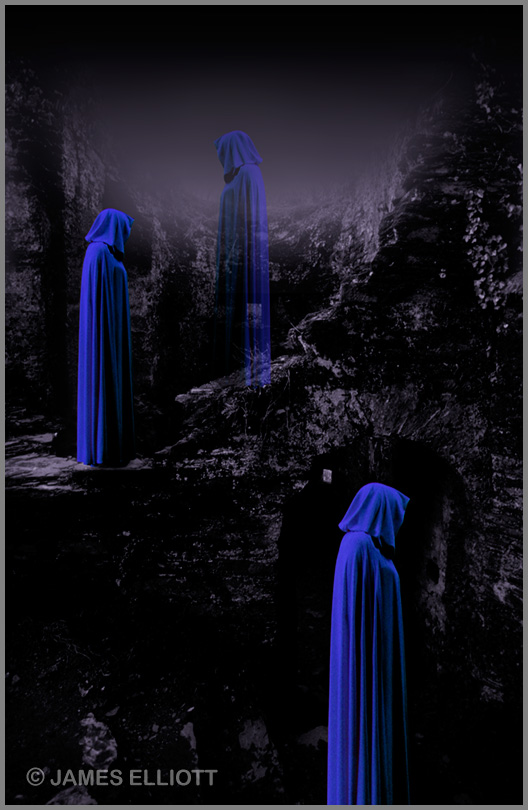 Legends Of The Dark And The Deep Epilogue 10 Years On A few days before I wrote the 'White Lady' essay in 2002, I created the picture "Imprisoned by the Darkness of her Own Shadow". Quite coincidentally. Like much of my Art, at the time of creation I don't really know what I am creating. I have often described my approach as being 'Like a somnambulist in a casino who constantly keeps hitting the jackpot.' The title for this piece came to mind automatically without any forethought, as it gave me the feeling of a Queen imprisoned in a dark tower awaiting her execution. I thought maybe Jayne Seymour or something. A very dark and haunting feeling of resigned abandon with an assumed air of defiance. Dignity in defeat. I realised much later it was another image based on the legend of Margaret Pomeroy. I also attempted to change the title several times because I thought it was meaningless, before suddenly realising that the 'dark shadow' meant Margaret's sister Eleanor (by whom she had been imprisoned). "....the castle was built by the Pomeroys in the 12th Century and the family occupied it until 1547 when it was bought by Edward Seymour, Duke of Somerset. Around 1700 the Seymours moved to their Wiltshire estate and the castle fell to ruins. Some say there was a fire..... The castle remained in Pomeroy hands until the late 1540's, when the castle was bought or acquired by other means by the influential Sir Edward Seymour. Edward was the Lord Protector and the brother of Jayne Seymour, Interesting coincidence. Growing up and living in Devon as I did, I am well aware of the indigenous population's love of a good mystical legend. The human race has always loved any tale of the supernatural. Possibly because life itself is a mystery. Who knows? I keep an open mind about these things. Some say the legend emanated from a Gothic novel published in 1806 entitled 'The Castle Of Berry Pomeroy' in which the protagonist was called Matilda and this was later somehow changed to Margaret. This almost sounds as far fetched as the legend. 'Matilda' to 'Lady Margaret' and then 'Saint Margaret's Tower' is a fair bit of leap frogging. Possible, though quite unlikely. But then, many think the bible was mostly lifted from 'The Epic Of Gilgamesh'. It certainly appears so and yet for millennia this was called 'God's Book'. I always suspected God could not possibly be anything as lowly as a writer. Shakespeare can't spin the planets. There will always be cynics, believers and fools. Somewhere in the mix, probably lies the truth. Assuming philosophically that there is any such thing as the truth. If you want my own take on it, I think the legend is probably apocryphal at least in part, but only because all history has to be. History is a work of fiction written by the victors. And constantly rewritten by the money. All fact contains a little fiction and all fiction contains a little fact. One thing is known. They were extremely violent times. This is why it is a castle and not a manor house, as clearly the location intended it to be the latter. Devon at that time was the most lawless part of Southern England. There were violent feuds between rival landowners. Fortification was not optional for people as rich as the Pomeroys. You couldn't just flaunt your bling in those days. You had to defend it as well. Still partly true today, I know. All I can tell you is that when I discovered the castle early in 1977 it had this incredible atmosphere, that you could feel in your soul. It was a crumbling ruins. My timing was immaculate. My masterpiece 'White Lady In Ruins' was created early in 1977 as evidenced by absence of leaves on the trees. I moved to London in the Spring, so it could not have been shot later in the year. The castle was then, as now, still owned by The Duke Of Somerset . Later in 1977 it was handed over for guardianship to what is now English Heritage. And they cleaned it up, completely changing the colour of the stone. They also removed all the ivy and overgrowth. And along with it, of course, all the atmosphere. The masterpiece would have been impossible had I delayed even a matter of weeks. Somehow the word 'Gothic' implies abandonment, crumbling ruins and overgrown decay. What is interesting is that these legends - apocryphal or otherwise - exist around this castle and not the others. 'Most haunted house in England' probably doesn't spring out of nowhere. And accolade or curse, I'm sure it is based on something! Whether or not I believe in ghosts (which I don't). After all, the mystery of the world still exists, whether or not I believe in the Gods (which I do in a non anthropomorphic metaphysical kind of way). Even though I would defer to Montaigne's poignant quip "Man is quite insane. He couldn't create a maggot and yet he creates Gods by the dozen." A directory of Gods published decades ago listed 35,000 Gods, that had existed at one time or another. Clearly, both God and the Devil are personifications of good and evil. G(o)od and the (D)evil. But I don't see Jesus spinning the Earth any more than the old myth of Atlas. Yet SOME power does. And please don't say 'Nature' or I'll laugh. What is fascinating here, is not whether one believes in Gods or Ghosts but rather the question as to why humans feel the need to invent them. There is an innate, profound desire in humans to hold a belief in phenomena beyond the bounds of physicality. And this is unlikely to exist for no reason. It may well be just an acquired inability to accept our own mortality. After all, the concept that all human life is without meaning, that it exists for no reason - is this not baffling?! So whatever the degree of truth in the legend, 'White Lady In Ruins' is a masterpiece regardless. What remains fascinating, is the fact that I created exactly the right image, in exactly the right place, at exactly the right time, without any knowledge of the legend. The picture appeals to that part of us, that wants to believe in the magical and 