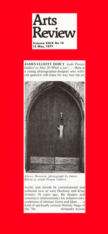 Immediately fascinating at first sight, Elliott without doubt created another timeless classic with his 1974 memento mori "Remorse". Obviously an image drenched with substance (rare in Modern Art) the picture portrays a tremendous feeling of guilt and eleventh hour regret. The flying hand symbolises man shaking off his mortal coil (Elliott read Shakespeare as a teenager) and in the moment of death trying to get back in through an obviously closed and fortified door. The door can be seen as representing conscience or as a symbolic representation of death's own door.