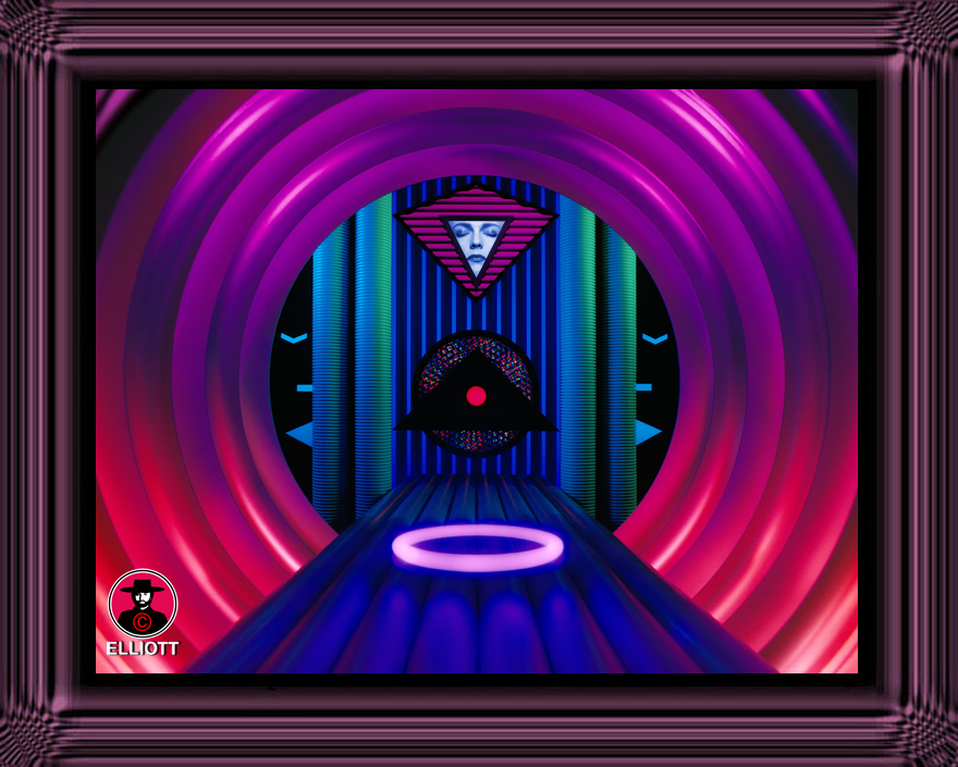 'Superchromatic Spectrosynthesis' is the world's first photographic Light Sculpture, with light being reflected, transmitted, projected, filtered and drawn in. There are 21 lights in all. The entire piece has no colour but is monochromatic silver and white with translucent elements. All colour has been introduced in the lighting to give it the glowing aura. It took Photography to a new level. Of all Elliott's magna opera this amazing Eighties masterpiece took the longest to create - an astonishing 407 hours of actual work. An entire summer from May to September 1986.