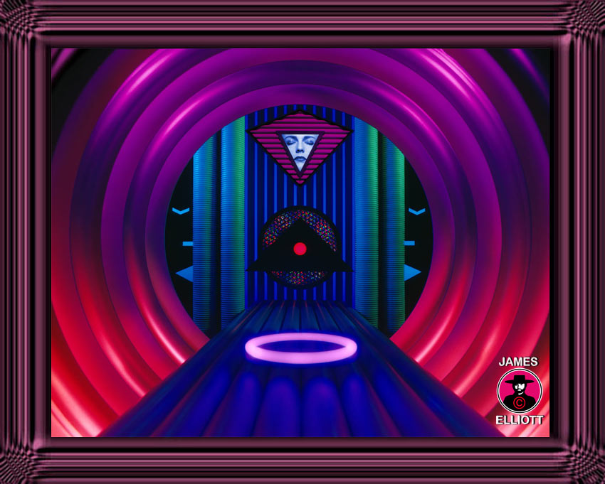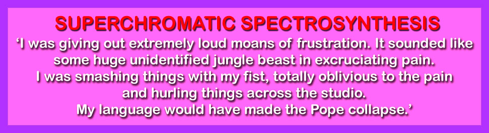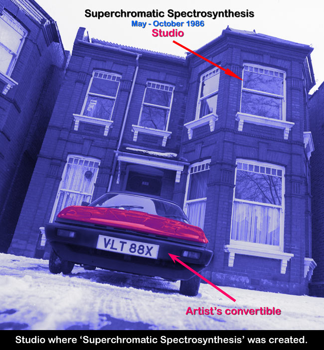 This initial flash of inspiration came on 18th January 1979, long before the masterpiece was actually created. Initially I just knew I had a good idea - but so what?! I had lots of fantastic ideas. However, I had learned many years earlier to distrust new ideas and put them to one side, to let them mature. I had hundreds, even thousands of ideas, just lying around in box files. More than I could ever do in a lifetime. So I had developed a sifting process to exponentially increase my creativity. My criterion was and is this. If an idea constantly returns to haunt me, without relenting, then it must have deep significance, so then I short-list it. If it gravitates towards the top of this list, then I commit unlimited resources to creating it. Time, effort or money just doesn't come into it. People are always moaning that they don't have the money to do this or that - but that's nonsense, because they sit there smoking, staring through the windscreen of their convertible as they say it. When I created my early Eighties fetish erotica classics, I spent so much dosh on them that I went broke and had to sell my lighting equipment to pay off the bank. For this reason - that when I commit it is absolute - I always circle an idea like an eagle, before making my swoop. Sometimes I fly away. Sometimes I come back. I like to look at the idea from every angle first. I circled this one longer than any other. Likewise with effort and time - I give it what it needs. I am always reading about this or that photographer who died and left 30,000 negatives and I think "What a load of crap! I wouldn't like to have to sift through that lot!" I have created around 250 images so far as I write this in 1999. If I live to create a thousand, no-one will be more surprised than me and as I shall never tire of saying "Prolificacy is the hallmark of those who lack perspicacity." I give images temporary and often nonsensical titles, just to give my brain something to point at. They are literally the first thing that rolls out of my mouth which connects with the image. Initially I called it "The Incredible Space-Age Polychrome Flitz". That was too much to chew so a couple of days later I wrote in my diary "Stellachrome Flitz", but to remind me of what a blinding vision it was. I settled for years on "The Incredible Stellachrome Flitz". The name only changed days before creation. "Incredible" was my feeling about the idea. "Stellachrome" was from "stellar" hence stars and so space and space-age and "flitz" was a shorthand scribble term meaning electronic flash. The reasoning behind "Superchromatic Spectrosynthesis" as a title was this. I knew it would be the most incredible labour of love. I knew people would never understand what was involved in creating the image - especially as in 1986 people in England were just so incredibly ignorant of Photography as Art. So I thought one way to help them understand was to give it a difficult title. Difficult to remember and difficult to pronounce and preferably with alliteration and a euphonic trip of the tongue. My titles like 'Madness Mistress Metamorphosis' or in a purely euphonic way 'Kiss On Frosted Glass' roll off the tongue in a way that make them a delight to say. My grammar school was pedantic about alliteration, grammar, spelling and syntax but I always found this small minded. The wise care not for such trivia. Used sparingly, alliteration is extremely effective. Of course the same teachers also hold up Jane Austen's 'Pride and Prejudice' as an example of great writing. Not to mention 'Sense and Sensibility'. The English language - like anything else which has evolved over time - is a bit of a mess anyway. People think that if they misspell something they have made an error. With me it is the reverse - I think the English language has made an error. It usually has. And it is high time someone sorted it out..... but we digress. Creative minds are rarely linear. The concept of the image was this incredible futuristic scenario, where nothing actually had any colour - rather like life. Physics and psychology tell us that there is no colour, it is just a human response to particular wavelengths of light. Cats see things in a more monochromatic way for example. And I knew that by giving colour only to the light, that fantastic saturation and purity of colour would be achieved. This would achieve the exact 'feel' that I wanted. An almost spiritual glow. Like something from another dimension. And that feeling you get watching a sunset. Because of this I procrastinated for years. Not on my art, just this particular piece. When it came to selecting images to create it was always deferred to 'next years' images. I knew I was going to need absolutely the right frame of mind to even begin it. And anyway, I had already figured out that effort does not equal result. However, on this occasion I searched in vain for a simple solution. Years went by - seven actually - and I knew that if I didn't make a start soon, I was simply indulging in self-delusionary evasion and I was never really going to do it at all. So it was late Spring, my favourite time of year - and we English are always full of enthusiasm as the year is reborn. Also it was becoming increasingly apparent that I would move from the Cricklewood Studio at some point - so I made a start on Saturday 31st May 1986. I have to say, there were many times when I wished I hadn't. But in life there is never a perfect time for anything and there is never a perfect anything in all eternity - so I made a start. Some aspects of my Photography are like painting an entire canvas in mid air then throwing it at the canvas in one hit. No picture was more like this than 'Superchromatic Spectrosynthesis'. It just always looked awful, nearly all of the time. Four months of fencing with chaos. This can be seen from the extensive documentation.' 'Superchromatic Spectrosynthesis' is the world's first photographic Light Sculpture. The original sculptur