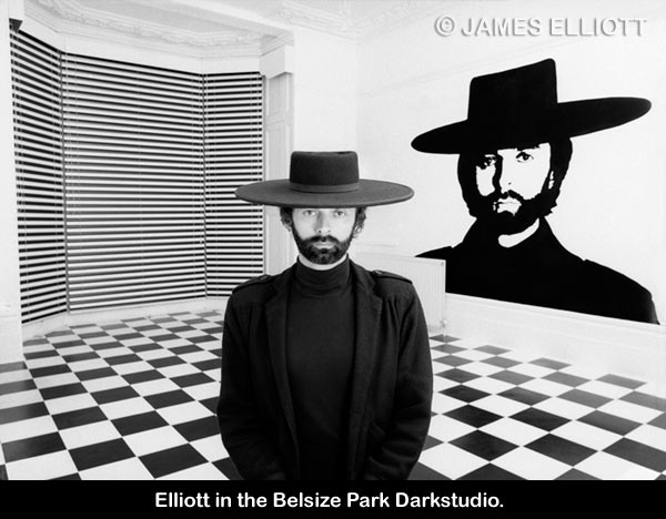 In 1986 Elliott also moved to 63 Belsize Park in London's Hampstead, where he designed and created the ultimate Darkstudio - a vast room capable of 100% blackout for totally controlled lighting and also colour printing. It famously also featured a glass chandelier, state of the art processing equipment, including thermostatically controlled water, a massive graphic mural of Elliott, a huge signature and a Bang & Olufsen stereo. Elliott created many of his Cibachrome masterpieces here.