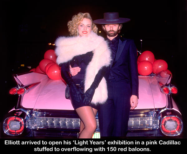 Elliott turned up to open his 'Light Years' exhibition in London's West End, in a Pink Fifties Cadillac Convertible, with Liz Caron. The solo exhibition at Visage Gallery ran for 4 months and featured 30 classic works.