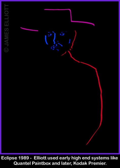 In 1986 Elliott created a very important image entitled 'Digital Visage'. An absolutely cutting edge piece of cyber art. This was a glimpse of things to come and having championed Photo Art, he would, for the second time, pioneer a revolutionary new art form. Elliott's first experiments in computer technology predate Photoshop. Elliott used amongst other things, the Quantel Paintbox and later, the Kodak Premier system. Elliott recalls perceiving a graphics tablet as 'The Canvas Of The Future'. Which was probably about right.