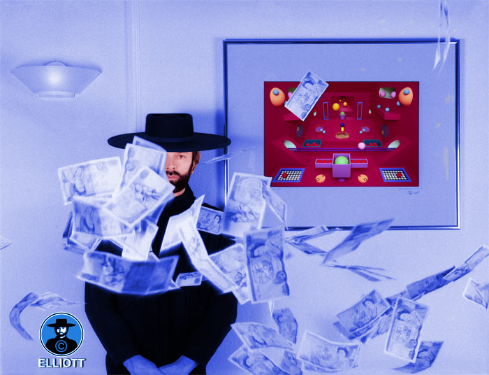 Elliott not only pioneered Photo Art but also the selling of it. In 1988 he sold a 24 inch 'Metasphere' for $3,000. An edition of 10, this was a national record for a contemporary artist photographer and Elliott went on to break the European record and ultimately the world record. This run of success saw 'Metasphere' eventually selling for $40,000 in 1995, having smashed records a staggering five times. These prices were literally unheard of at the time. $40,000 was the price of about 3 new cars. Remember, few thought photography was art back then and even fewer bought it. In order to experience the success, Elliott asked Liz Caron to draw the money from the bank in Shakespeares (£20 notes) and throw it all over him, the better he might experience his success. Elliott not only pioneered photo art, but the selling of it, too. This was all reported in the press and perhaps Elliott did more than any other single photographer, to ignite interest in the contemporary photography market.