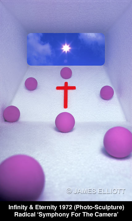 In the very early Seventies, when Elliott was still very young, he created the revolutionary 'Infinity & Eternity'. This was his first real 'Symphony For the Camera', where the artist orchestrated reality for the camera. Literally sculpting and hand painting the creation meticulously for the static camera viewpoint. Photography back then, was a question of moving the camera through time and space and recording, so in effect, orchestrating the camera for reality. These 'Symphonies For The Camera' as Elliott called them, were the complete antithesis of the observational recording of the day, the overwhelming majority of which was still in black and white. Elliott by this time had already abandoned monochrome and apart from creating revolutionary work, was also pioneering colour. And showing great command of it. With 'Infinity & Eternity', the restriction of the palette to just three beautiful colours, adds tremendous power. Perhaps the really extraordinary thing about Elliott's early work, is the depth and substance. This image, like so many others in the canon, have an unmistakable spirituality and profundity, quite apart from the aesthetic quality. It is extremely rare to find these qualities in the work of an artist, still so very young.