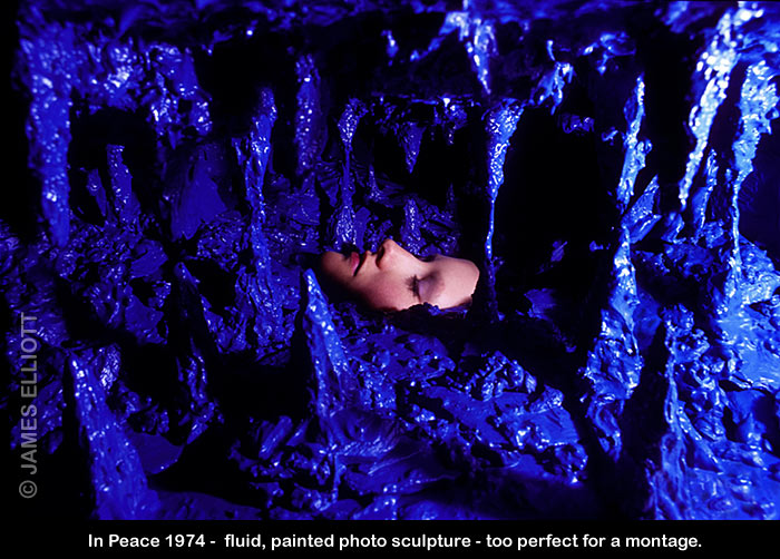 Following on from 'Infinity & Eternity', Elliott created 'In Peace' 1974 straight out of his imagination. This time using a more fluid, less geometric approach. The artist always claimed his influences were not artistic, but rather girls, music and the extraordinary things he encountered in life. The image was inspired by a memory of childhood subterranean exploration, in his home town, underneath a graveyard. A secondary influence, was a piece of music which Westward Television mistakenly told Elliott was called 'Buried Alive'. It was actually titled, 'The Days Of Pearly Spencer', but the incorrect title struck a chord. And the final influence was his muse, Mars, featured as the central jewel. There you have the three aforementioned influences. 'In Peace' was a new level of control and creativity in Photography and led on to many wild and wonderful masterpieces. This was an early 'Symphony For The Camera'. Unquestionably seminal work. As indeed, were the myriad of other creative and technical ideas Elliott innovated at the time. Elliott was literally 'opening up' photography and raising the bar magnificently, from a creative and technical standpoint. Everything was done without assistance. Assistants are the badge of the commercial artist.