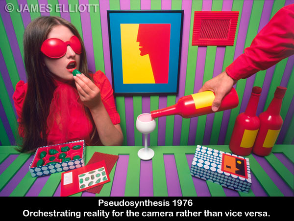The early Seventies shows Elliott exploding the medium of Photography in a hundred different directions, with many new trajectories, often showing multiple innovations in a single image. This is well exemplified by 'Pseudosynthesis' of 1976. Elliott not only created the entire scenario but also created the minimalist painting. He aerosprayed the sunglasses and chocolates. Created the bottles and box, and so on. He even mixed and matched the exact hues of his exceptionally strident and highly original colour palette. Such autonomic creativity was unprecedented in photography.