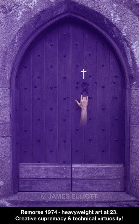 Elliott rapidly became both a creative supremo and a technical virtuoso of Photography. This was typified by much loved classic 'Remorse', which involved new, highly sophisticated levels of optical masking and shadow coloration - both innovations. Two techniques amongst a myriad of others he pioneered. There is no afterwork of any kind. No Photoshop, as it didn't exist and no montage as that would not allow the seamless perfection required. So it was all done in camera. The artist was learning to control light in sophisticated ways.