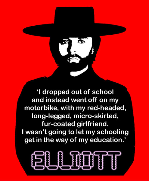 Elliott's grammar school was run by martinets, who considered Elliott a rebel and he was constantly in trouble for ignoring rules he considered ridiculous. With his long Oscar Wilde haircut, op art shirts, drainpipe trousers and Cuban heel Chelsea boots, he was caned on average once a week, for unacceptable behaviour and ignoring the strict dress code. Long hair was forbidden and school uniform was mandatory. Elliott considered the futile attempts to curb his exuberance, flamboyance and creativity, quite disturbing. An education in itself. So he refused to conform with the drab, moribund, all-pervasive dullness of a half past generation. He argued with his masters, that the school and its uniforms, were 'artistically bereft of taste' and that his dress sense was 'superior to the uniforms'. He further argued that there was nothing wrong with his stylish appearance, only their response to it.