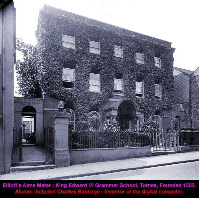 Elliott eventually comes to detest the establishment for their attempts to crush his creativity (which patently had the opposite effect). In the 60s the main building on the HIgh Street , Totnes, was known as 'Mansion' and was a foot (30cm) deep in ivy (q.v.). Symbolic of the fact that nothing had changed there in centuries. For a creative innovator like Elliott, old school was an inevitable culture clash. And anyway the young Elliott had girlfriends and lost interest in schooling.