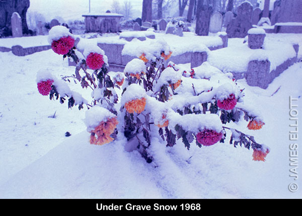 Later that year Elliott decided he was either going to be a photographer or a rock guitarist. He also created his first art photographs. Heavyweight images like 'Under Grave Snow' which shows flowers dying under the weight of heavy snow, on an unmarked child's grave. Partly inspired by Francoise Hardy's allegorical dirge, 'Mon Ami La Rose', which Elliott listened to both in French and English as a teenager. And note the artist's titular innovation. Another example is 'The Solemn Sleeping Silence of Snow' (q.v.). Elliott makes great use of allusion, alliteration, euphony, poetry, even coining words, at a time when no-one titled photos. Untitled 49 and all that laziness.