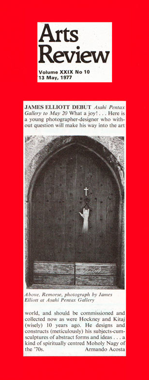 In May 1977, Elliott left Devon permanently, to go and live in London. His girlfriend model and muse, Mars, moved with him. In the same week he opened a one man show, entitled James Elliott's Debut Show, at the Pentax Gallery, in the West End of London. This was close to Piccadilly Circus and was one of only two, recently opened galleries in London, showing photography. The exhibition was critically acclaimed and drew crowds.