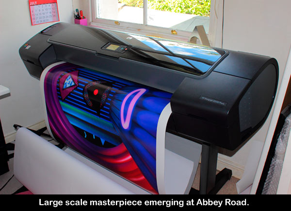 Elliott creates his first really large scale masterpieces, after buying his own large format giclée printer. They were printed in the computer room at Abbey Road, St John's Wood, London. The pieces created were up to 54 inches (137cm) wide.