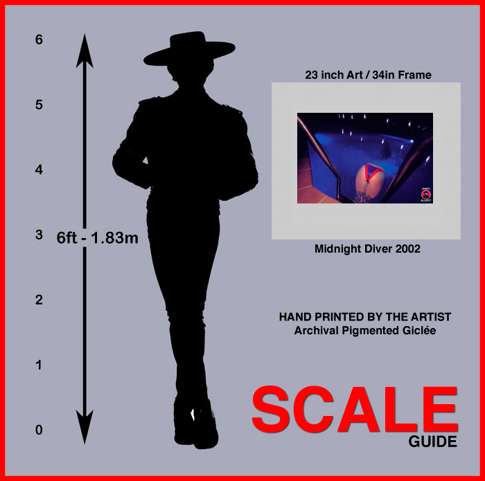 MIDNIGHT DIVER Elliott likes to live in a state of perpetual stimulation and try out extravagant new ideas, that appeal to his imagination. He decided to try some one night in Italy and ended up with this arrestingly original image. Elliott froze the action with a flash, but extended the exposure for many seconds to follow the underwater path of the diver, seen as an eerie, shadowy, underwater spectre. Elliott’s possesses the innate ability to pull originality out of the ether and create one-off images. They are without precedent and he never repeats them, preferring instead to innovate every time he created. He not only creates images that look like nothing else, they don't even look like his own. "The art of originality is to create that which one cannot imagine." Unique World Edition Of Originals: 6 (1 available) Size Of Piece: 23 x 15 inches Size Of Frame: 34 x 27 inches Original Type: Vintage Cibachrome Deluxe 1986 Hand printed by The Artist Price Please Enquire SIGNED BY THE ARTIST IN STOCK. ARCHIVAL MOUNT. LUXURY GOLD METAL FRAME.